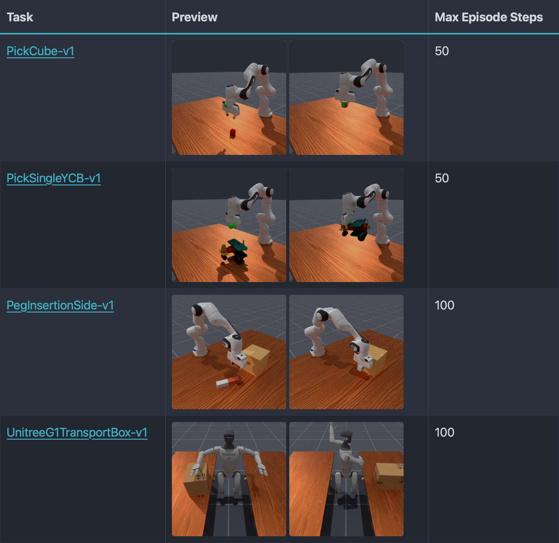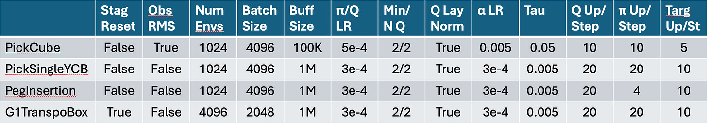 For simplicity, we keep learning rate, buffer size, etc the same for PickSingleYCB, PegInsertionSide, and UnitreeG1TransportBox. We make an exception for PickCube, the easiest task in our suite. Because PickCube is fairly easy to solve, we can use higher learning rate, more aggressive Q-target polyak averaging, smaller buffer size, etc, without worrying about training instability.