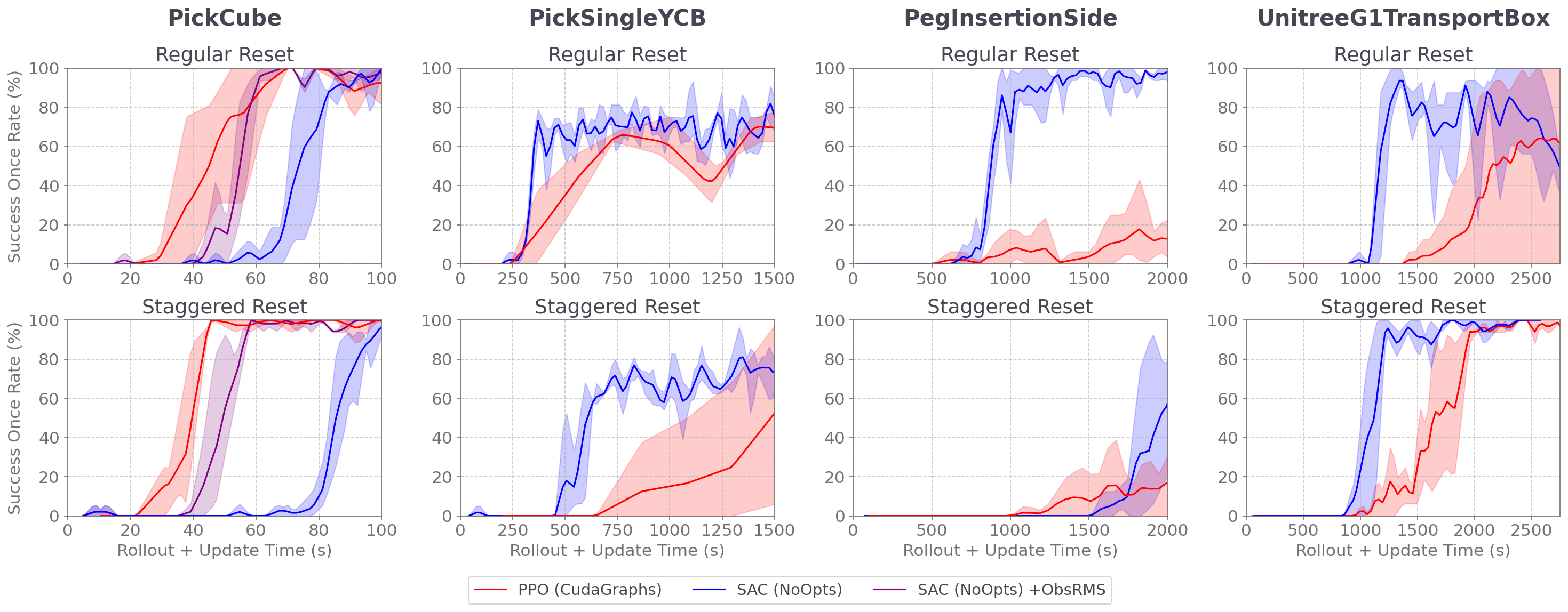 We use the tuned PPO + CudaGraphs baselines provided by ManiSkill. It is important to emphasize: while the PPO baselines use CudaGraphs to optimize speed, our SAC implementation currently uses no such optimizations. The provided SAC results can be made even faster with torch.compile/CudaGraphs support. We also test PPO with staggered resets for fair comparison.