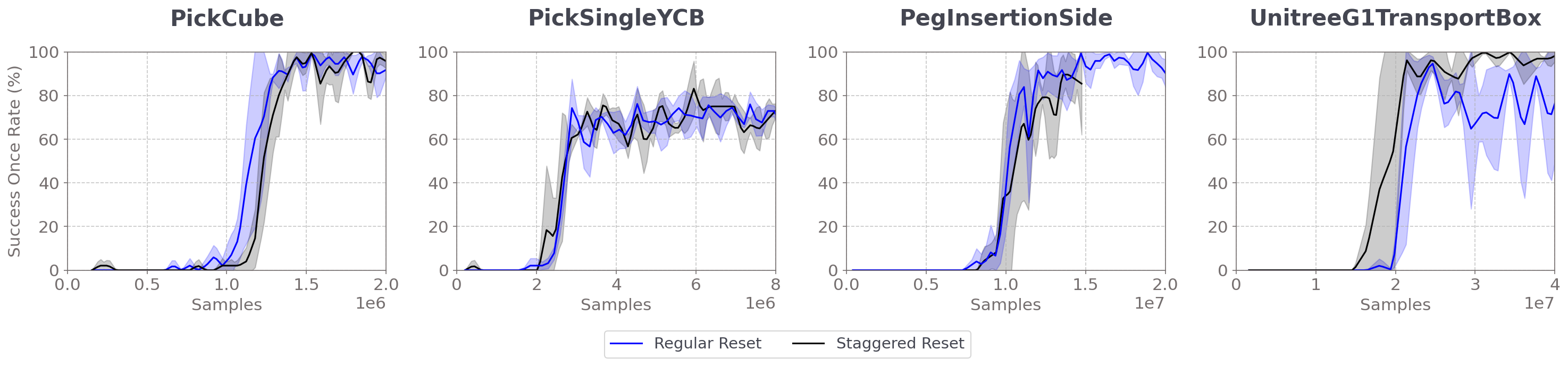 First, we observe that sample efficiency is comparable even in PickSingleYCB and PegInsertionSide, where training with staggered reset was notably slower wall-time than with regular reset.