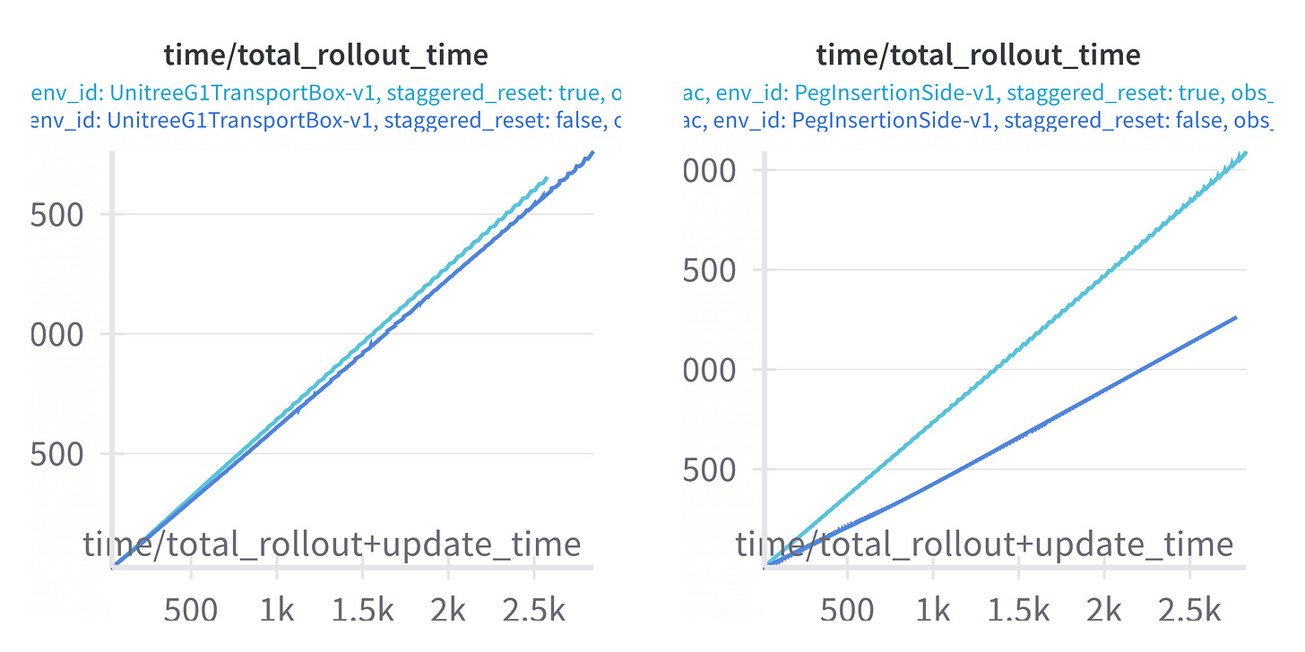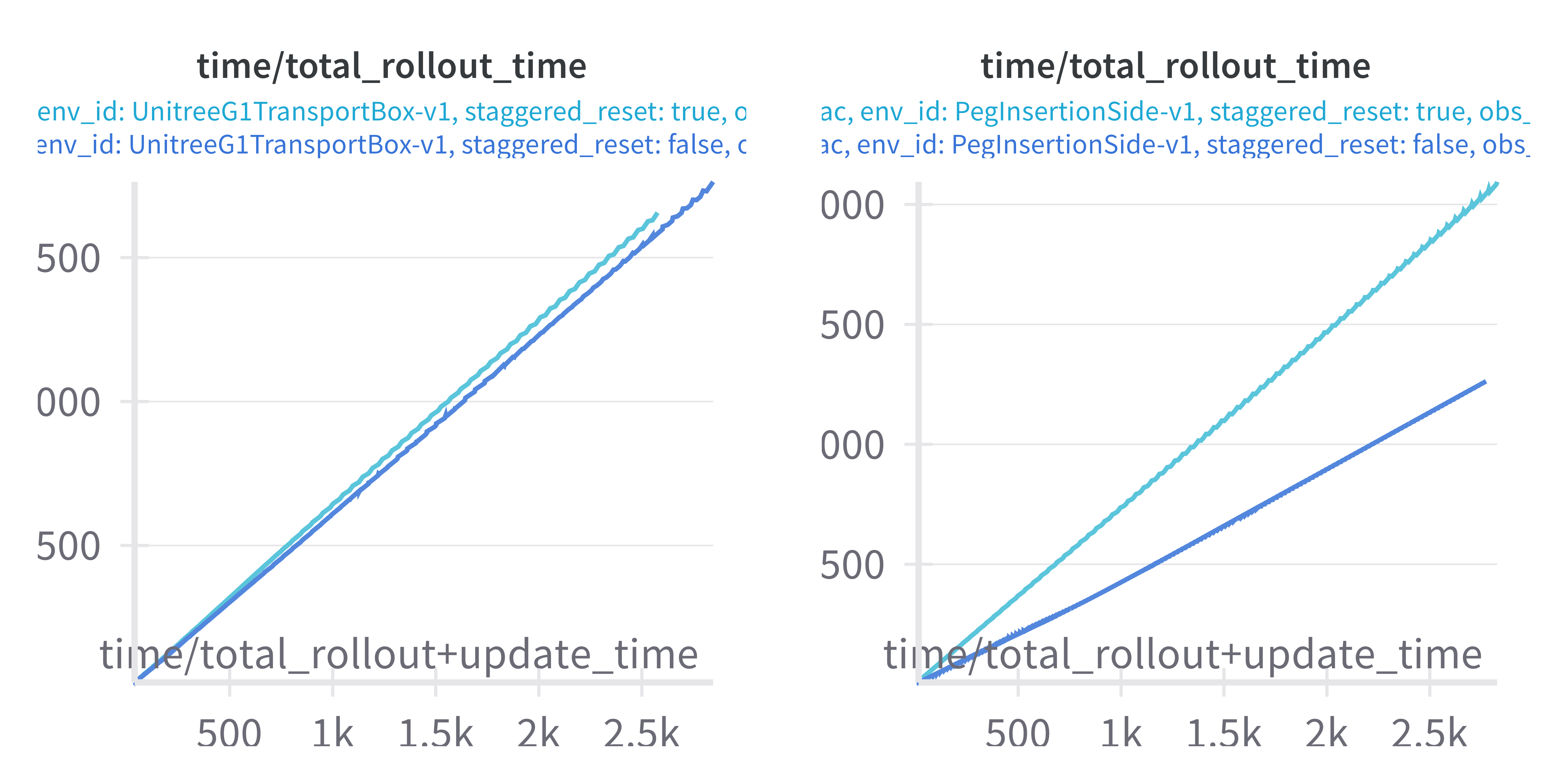 Furthermore, we see in UnitreeG1TransportBox that rollout time with and without staggered reset is comparable, but in PegInsertionSide rollouts are 40% slower with staggered reset. So, while staggered reset can improve convergence, if resetting an environment is slow, then the gains from staggered reset are lost to increased rollout time.